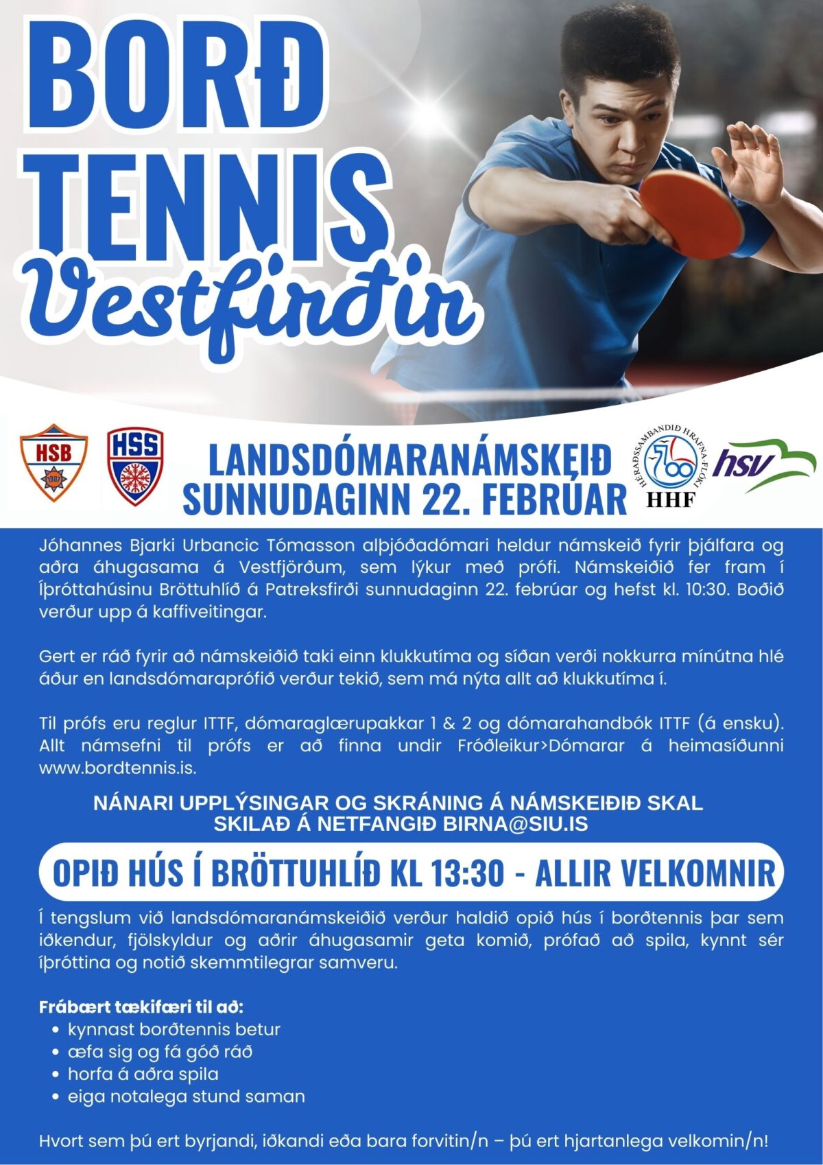 Í tengslum við námskeiðið verður opið hús í borðtennis kl. 13:30 þar sem iðkendur, fjölskyldur og aðrir áhugasamir geta komið, prófað að spila og kynnt sér íþróttina. Allir velkomnir.