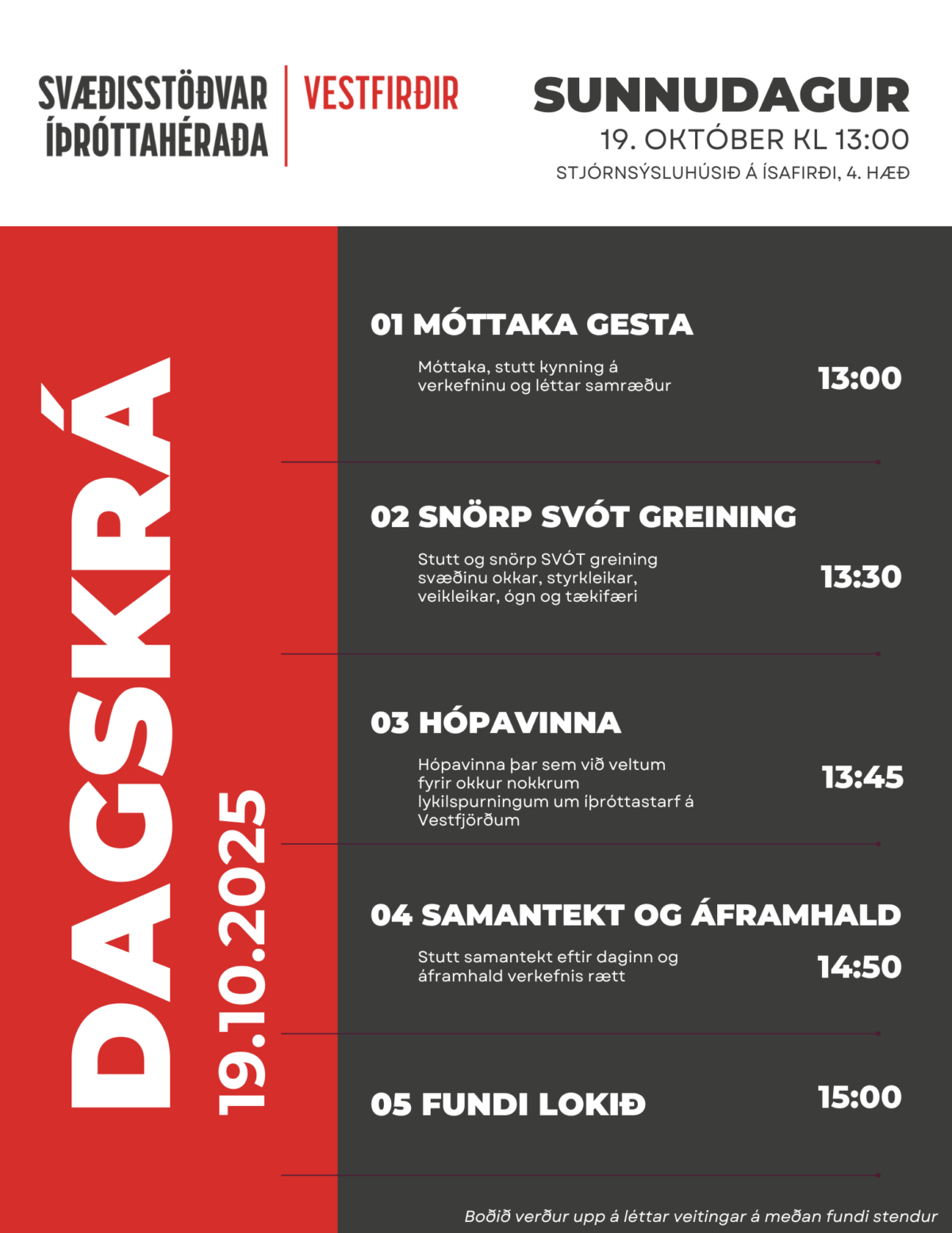 Markmiðið með fundinum er að efla samvinnu héraðanna, greina styrkleika og áskoranir og leggja grunn að sameiginlegri framtíðarsýn fyrir íþróttastarf á Vestfjörðum.